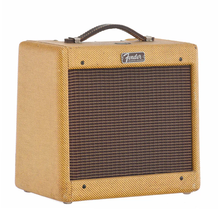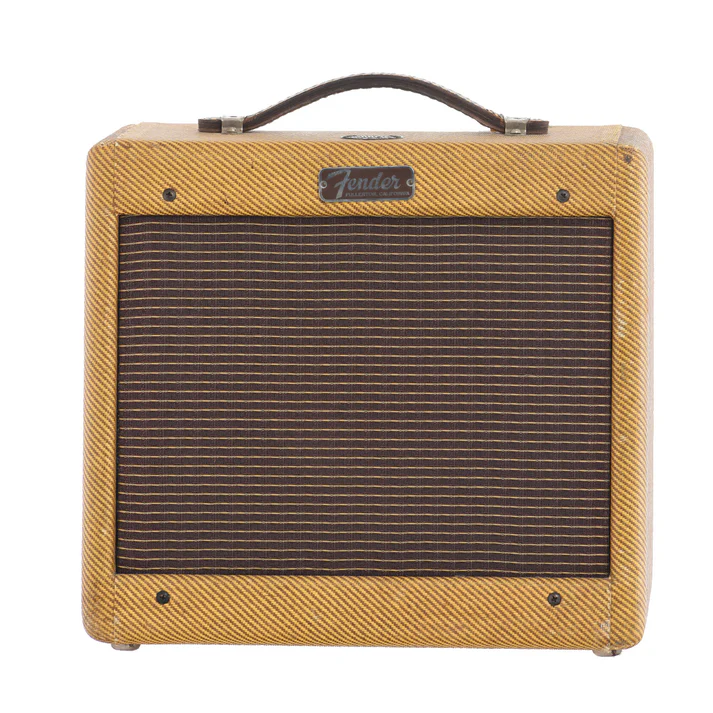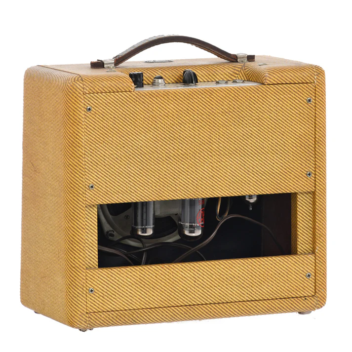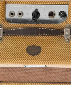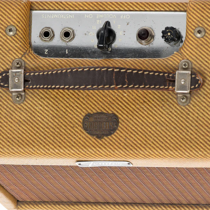 L’amplificatore combo Fender Champ del 1956 rappresenta un classico del design vintage, dotato di un circuito 5F1 e un suono caldo e potente da 5 watt. Con il suo rivestimento in tweed e il badge Hardens Music Store, è una vera gemma per i collezionisti.