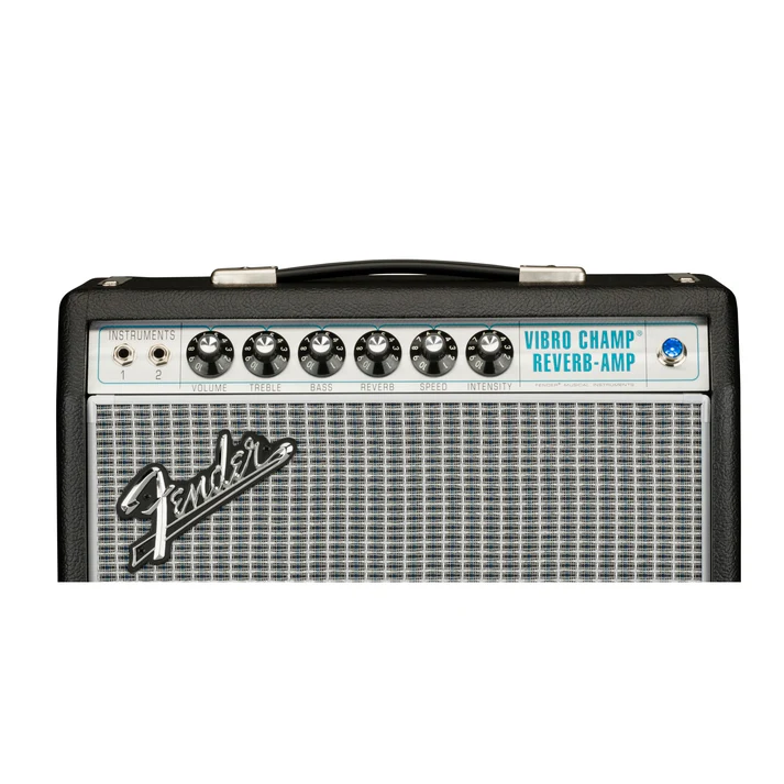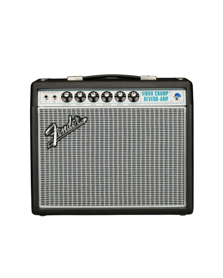 At just 5 watts, the original Vibro Champ® was famous for classic Fender tremolo, tube sparkle and killer grind at a reasonable level. The ’68 Custom Vibro Champ Reverb improves on this classic amp by adding a hall reverb and using a larger 10” speaker for increased low end. These additions make this little wonder perfect for rehearsal, home recording and even small gigs. Amplifier comes with fitted cover.