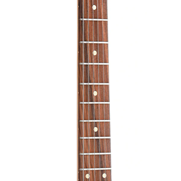 La tastiera in Pau Ferro, con un raggio di 9,5″, offre una superficie ideale sia per gli accordi che per gli assoli, mentre i 21 tasti medium jumbo facilitano l’esecuzione di bending e vibrati. Il capotasto in osso sintetico e gli intarsi dot bianchi completano le caratteristiche di alta qualità di questo strumento.
