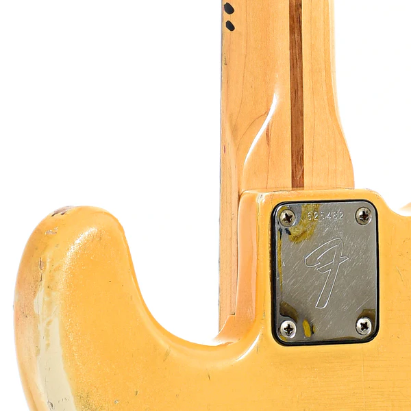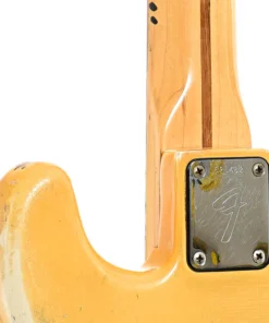 La finitura bianca originale, ora elegantemente invecchiata in una tonalità giallastra, conferisce al corpo in frassino un aspetto distintivo e ricco di storia. Il manico in acero monoblocco, con il caratteristico “skunk stripe” e intarsi a punti neri, offre una suonabilità fluida e confortevole, tipica dei modelli Fender di metà anni ’70.
