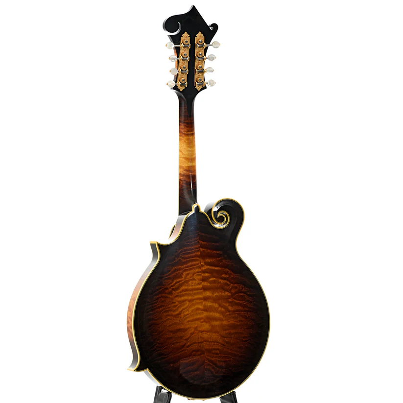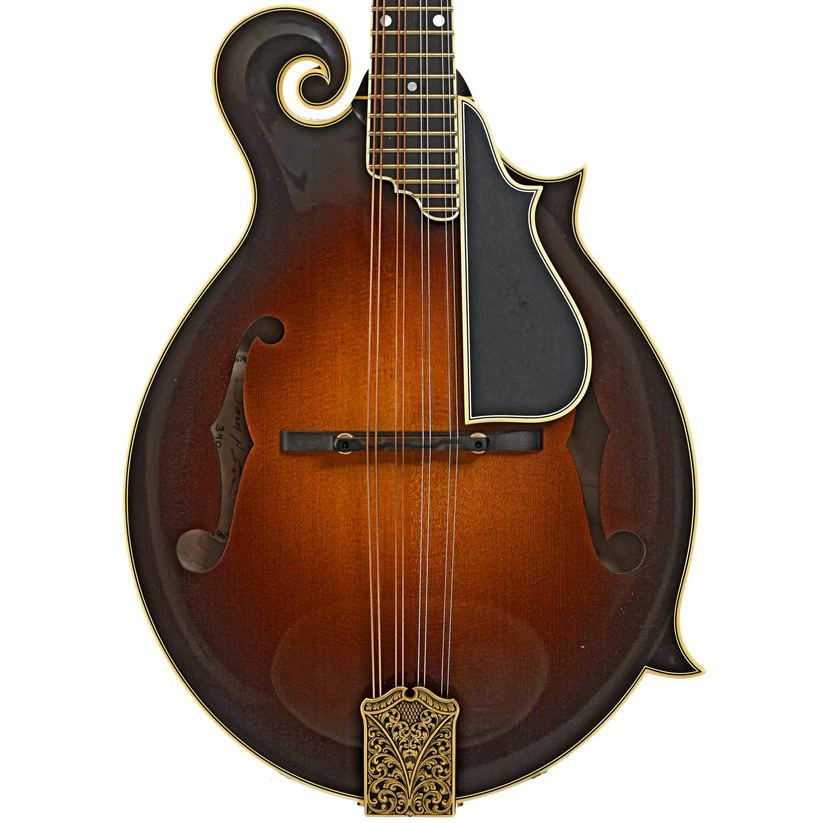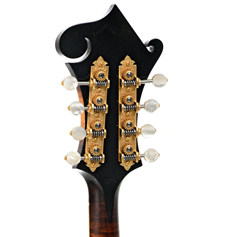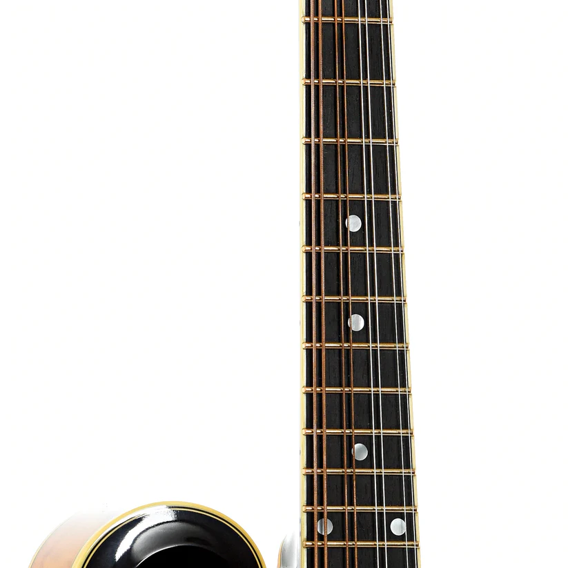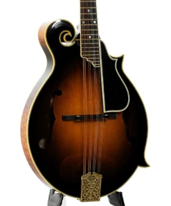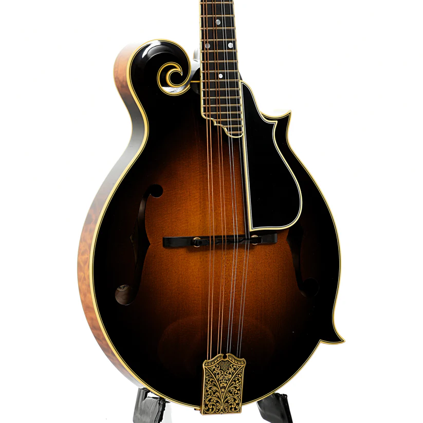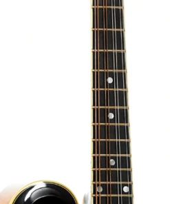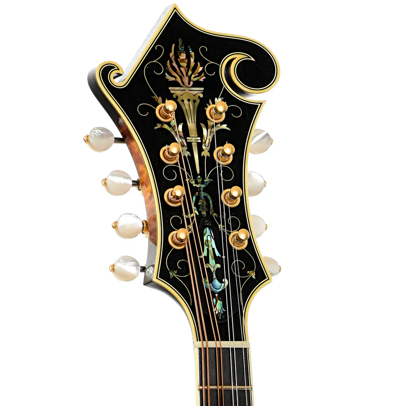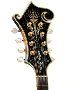 L’Ellis F-5 Reserve è una scelta ideale per i musicisti più esigenti grazie alla sua precisione e sonorità superiori. Le sue caratteristiche includono una tastiera in ebano legata e rifinita con intarsi in madreperla, 22 tasti d’oro e un ponte regolabile in ebano. La paletta è arricchita da un logo elegante e intarsi floreali, mentre il copritelaio del ponte è ornato da una raffinata incisione.